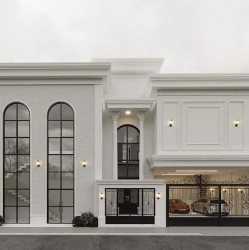 واجهات كلاسيك: أعمدة وزخارف جبسية، مع استخدام الرخام أو الحجر الطبيعي.
